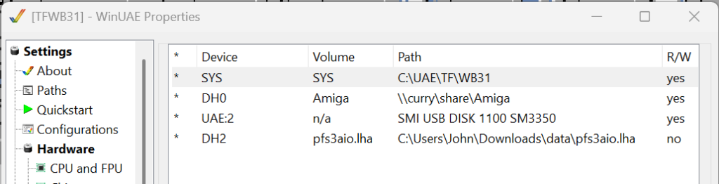 this is how it looks like fo rme. where my SYS: partition is a directory on my PC. DH0 is a share on my server and then you can see the harddrive I just added. now Start UAE by klicking “Start”