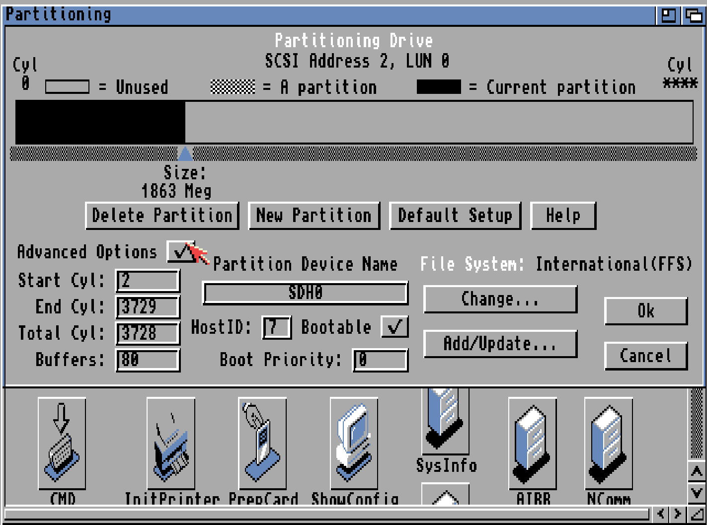 Press “OK”. Now check all info. you have your partitions ok, Partition name (SDH0 in my case) . you have your boot disk selected as “bootable”. Remember you can choose ANY Partitionname. I have used SDH0: here for simplicity. you can use anyting. DH0: is recomended as first disk. and this can be changed without loosing data. (However you cannot change size!)