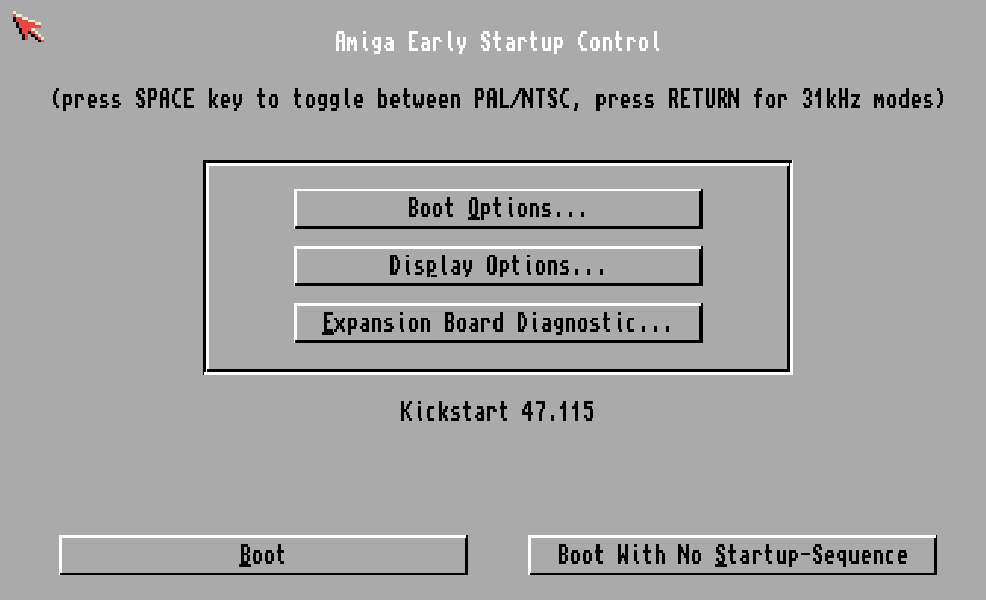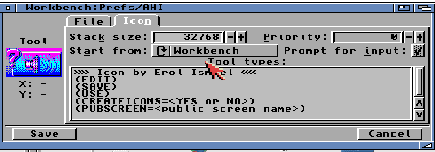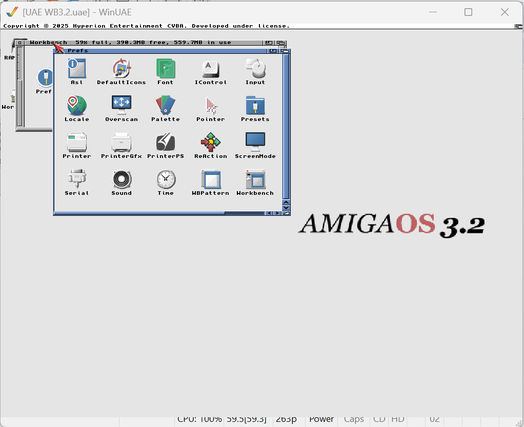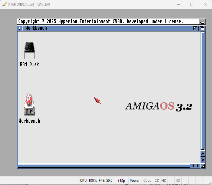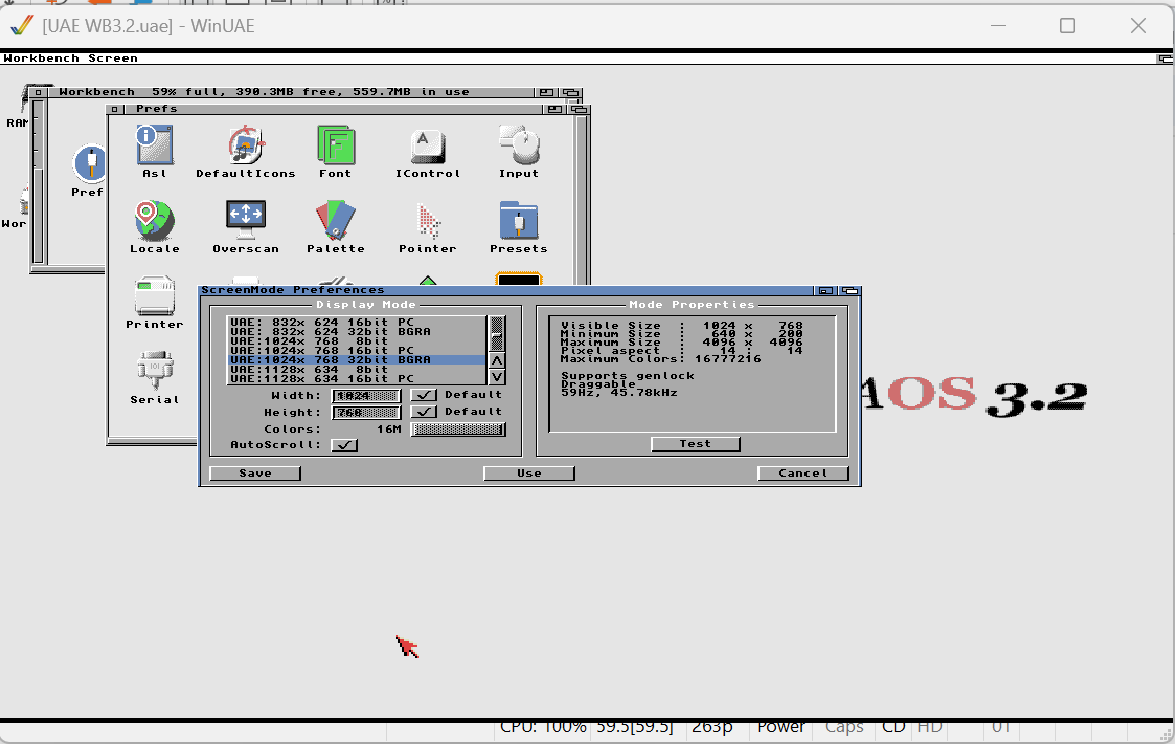 Also. hold down right mousebutton, go up in meny and tick off “Backdrop” to let AmigaOS run in screenmode. and save by hold down right mouse, Window -> Snapshot -> all