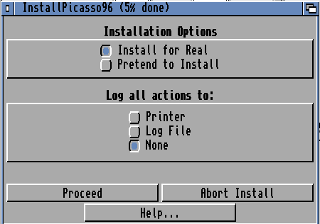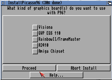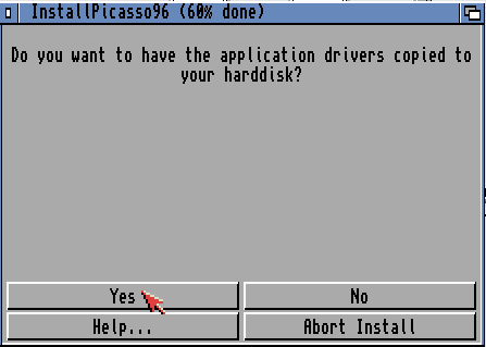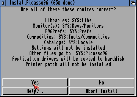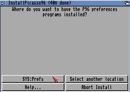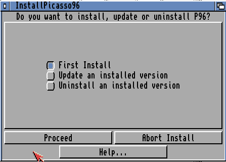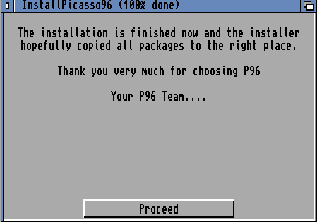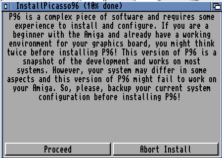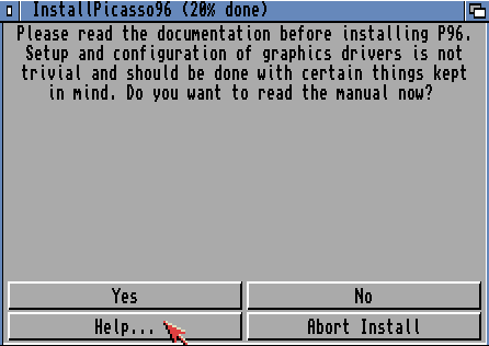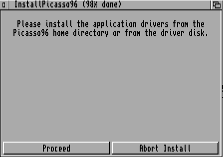 To clean up. F12 and Floppy Drives. eject any disk, and CD & Hard drives click on your Picasso96.lha and remove. -> OK and reboot your amiga (Amiga reuquires a SHITTON of reboots ๐ )