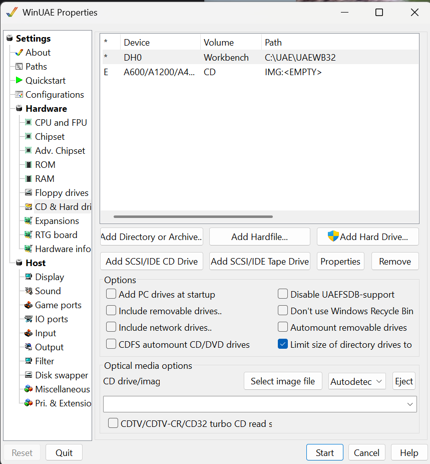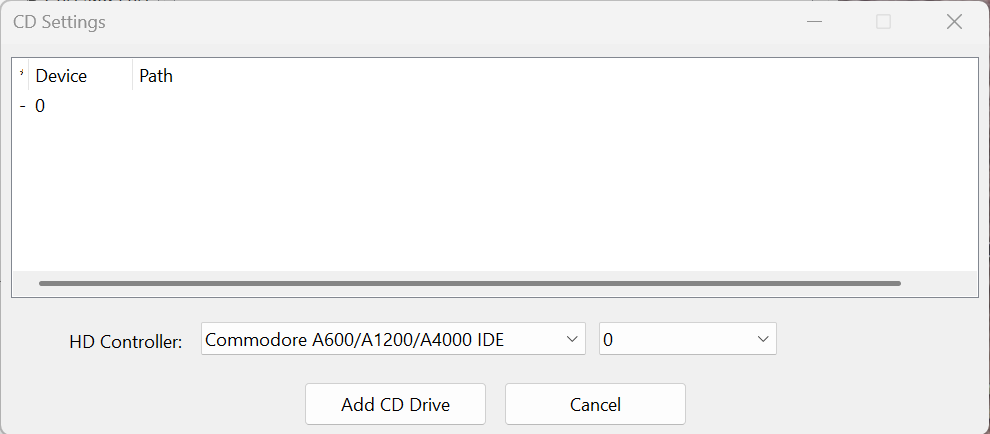 Change “HD Controller” to “Commodore A600/A1200/A4000 IDE” and device 0. Click “Add CD Drive”